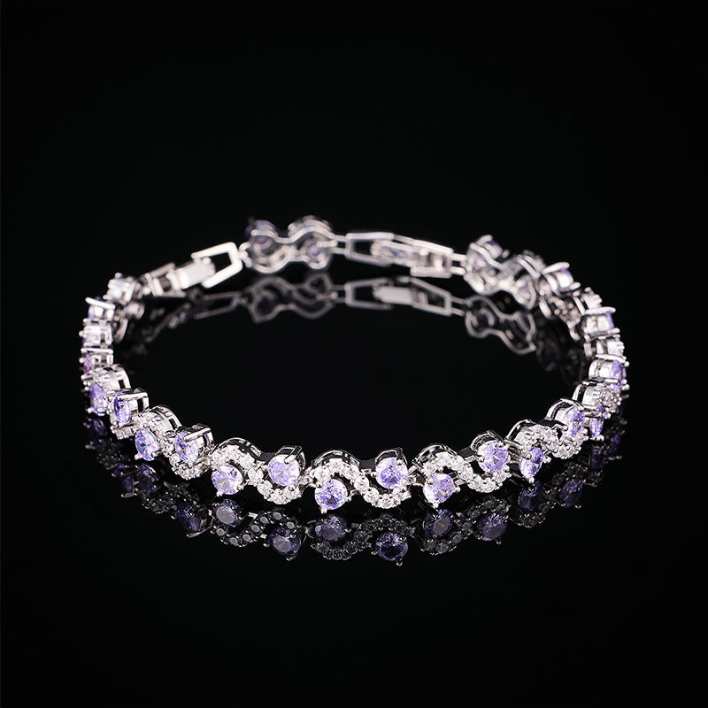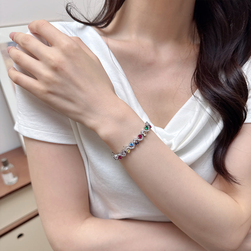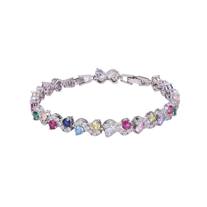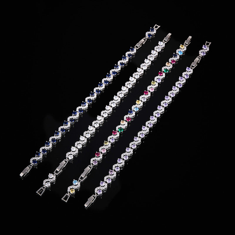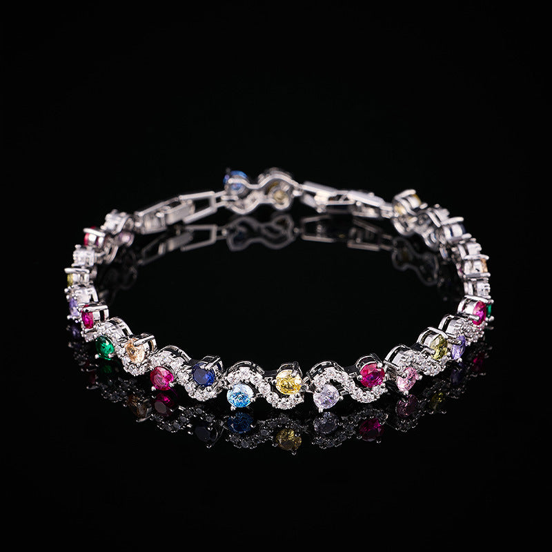 Işığın farklı tonlarını tek bir çizgide buluşturan bu tasarım, her renk seçeneğiyle bambaşka bir hikâye anlatır. Lacivert taşların derin ve sakin parıltısı, gökkuşağı tonlarının neşeli enerjisi, pembe–yeşil uyumunun modern dokusu ve lilanın yumuşak zarafeti… Hepsi, bilekte ince bir zarafetle birleşerek görünümü tek hamlede güçlendirmek için tasarlanmıştır.