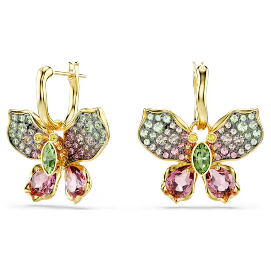 Renklerin dans ettiği bir zarafet… Bu çarpıcı kelebek küpeler, farklı renk ve kesimlerdeki kristallerle süslenerek neşeyi ve canlılığı adeta yeniden tanımlıyor. Pavé, chatonnage ve Pointiage™ taş yerleştirme teknikleriyle hayat bulan her bir detay, lüksü ve kusursuzluğu bir araya getirirken; altın kaplama yüzey sıcak ve zarif bir zemin oluşturur. Hafif ama etkileyici formuyla, ister gündüz ister gece kombinlerinizde stilinizi parlatmak için ideal bir seçim. Daha büyülü bir görünüm için uyumlu kolyeyle birlikte kullanarak Crystalia’nın Idyllia koleksiyonuna ait bu parçayı tam bir zarafet hikayesine dönüştürebilirsiniz.